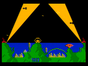 Different waves take place at different times of day on the Intellivision. At night, spotlights sweep the sky to expose ships lurking in the darkness.